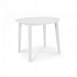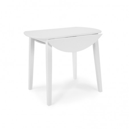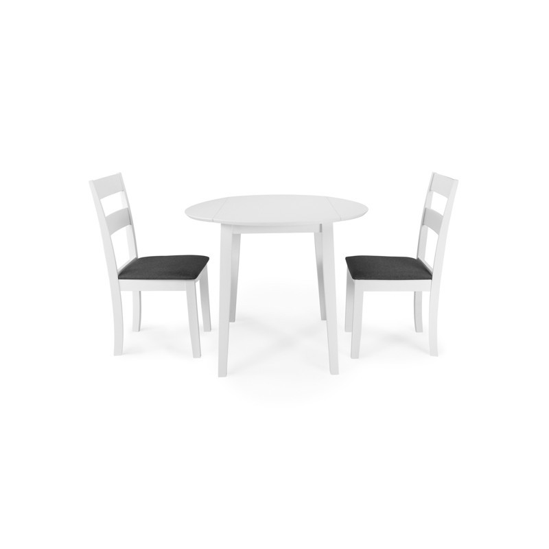 Maru es un set que se compone de una mesa extensible tipo libro para cocina o comedor y dos sillas a conjunto en el mismo material y acabado, perfecto para estancias pequeñas que desean ahorrar espacio. Esta mesa se compone de un sobre redondo, fabricado en melamina de alta calidad y lacado con un precioso color blanco mate, también consta de cuatro patas en madera y lacadas en el mismo tono para obtener un total look. Las sillas a conjunto están fabricadas en el mismo material y constan de un almohadillado tapizado en tela gris.