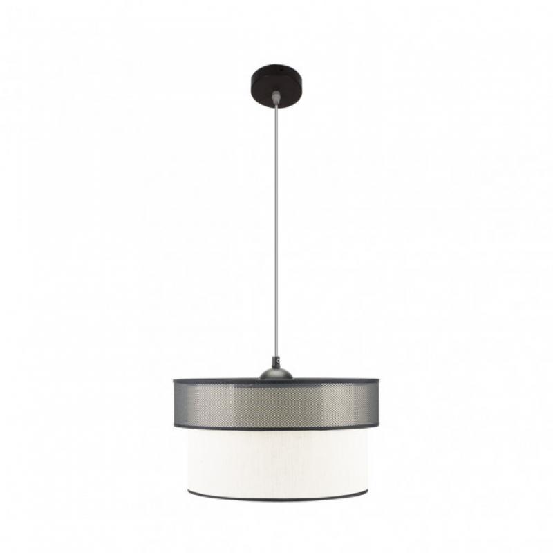 Colgante de la serie FELIX de color NEGRO/BLANCO. Realizado en metal y textil, se compone de dos pantallas, una más estrecha de tela de malla negra que corona la pantalla más ancha de color blanco, todo ribeteado en negro, resultando una bonita combinación de texturas y juego de colores. De estilo moderno y sencillo, a la par que elegante y original, ideal tanto para dormitorios, salones y salas de estar abocadas al descanso, como para comedores y lugares de trabajo. Posee un portalámparas E27. Bombilla no incluida. Tiene unas dimensiones, regulables en altura, de 35<,148x40x40 centímetros, y un peso neto de 810 gramos. En esta serie podemos encontrar tanto el colgante de 40 centímetros de diámetro como el de 50 centímetros  de diámetro, disponibles ambas medidas en negro/blanco, negro/rojo y negro/dorado.