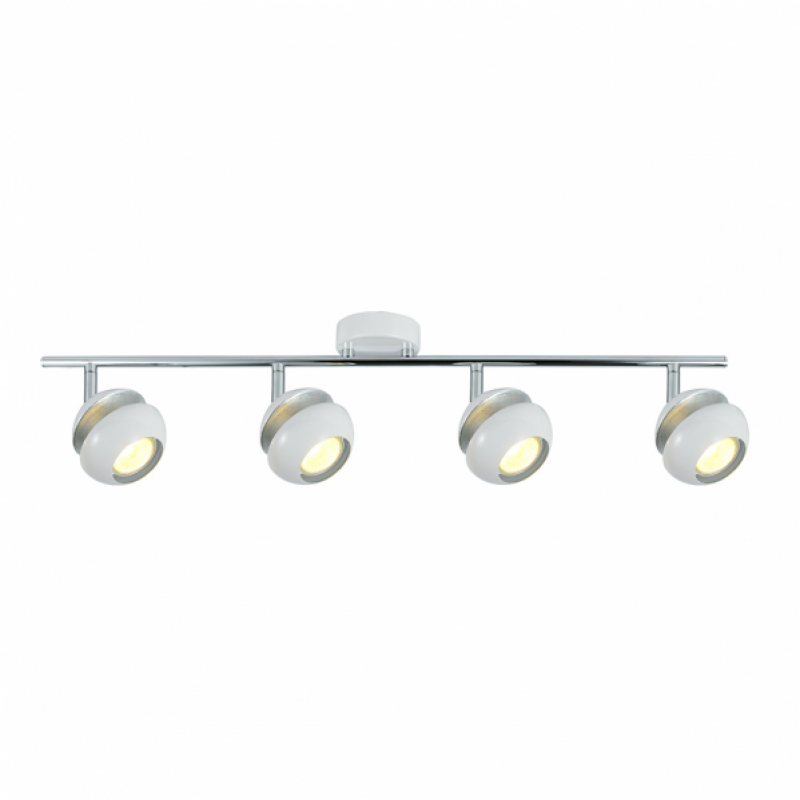 Regleta con cuatro focos de la serie BEETHOVEN de color BLANCO/PLATA. Realizada en metal con cuatro portalámparas GU10 . Bombillas no incluidas. De diseño moderno y original, combinando el blanco con la terminación en pan de plata, con focos redondeados y articulables verticalmente, con un giro horizontal de casi 360º permitiendo así dirigir los puntos de luz hacia cualquier zona de la estancia. Sus dimensiones son 14X69,5X8,5 centímetros. Modelo también disponible en color negro/oro y la versión de regleta de tres luces, regleta de dos luces, plafón de tres luces, colgantes de tres y cuatro luces y foco de una luz.
