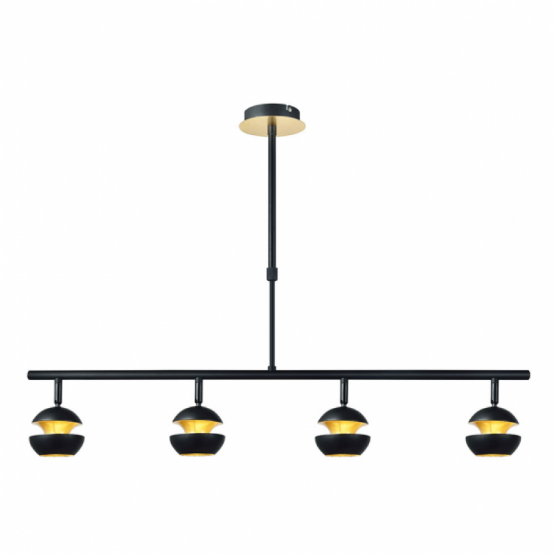 Colgante con cuatro focos de la serie BEETHOVEN de color NEGRO/ORO. Realizada en metal con cuatro portalámparas GU10 . Bombillas no incluidas. De diseño moderno y original, combinando el negro con la terminación de pan de oro, con focos redondeados y articulables verticalmente, con un giro horizontal de casi 360º permitiendo así dirigir los puntos de luz hacia cualquier zona de la estancia. Sus dimensiones son regulables en altura de 44<,68X80X12 centímetros. Modelo también disponible en color blanco/plata. Se puede completar la colección con la versión de colgante de tres luces, regleta de cuatro luces, regleta de tres luces, regleta de dos luces, plafón de tres luces y foco de una luz.
