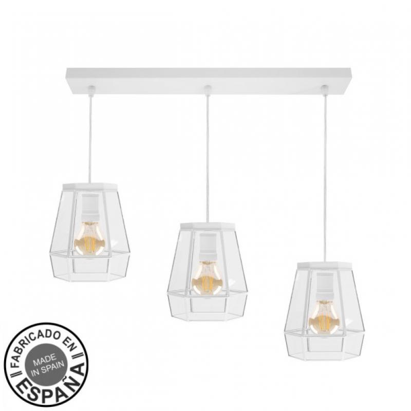 Regleta de tres luces de la serie GUIA realizada en metal de color BLANCO y cristal. Piezas únicas y artesanales, producto nacional HECHAS A MANO con un diseño original y elegante, destacan los dibujos geométricos de sus tulipas recordándonos a las lámparas de cristal emplomado, pudiéndose disponer a la misma o a distintas alturas, mezclando materiales y texturas, resultando una composición muy decorativa. Posee tres portalámparas en E27 . Bombillas no incluidas. Ideal para salones, comedores y salas de estar decorados con distintos estilos de decoración, desde el Boho Chic y Vintage como el clásico o rústico. Se recomienda completar con bombillas de filamentos para preservar su estética, como la de referencia 141351181 ó 141351081 que es las que apreciamos en la foto. Modelo disponible en regleta de tres luces, plafón de tres luce y colgante, todos ellos a elegir con terminación en blanco, negro o cuero, para escoger el que mejor se adapte a su decoración.