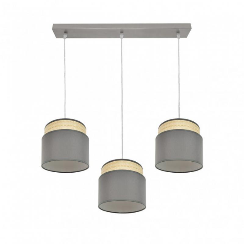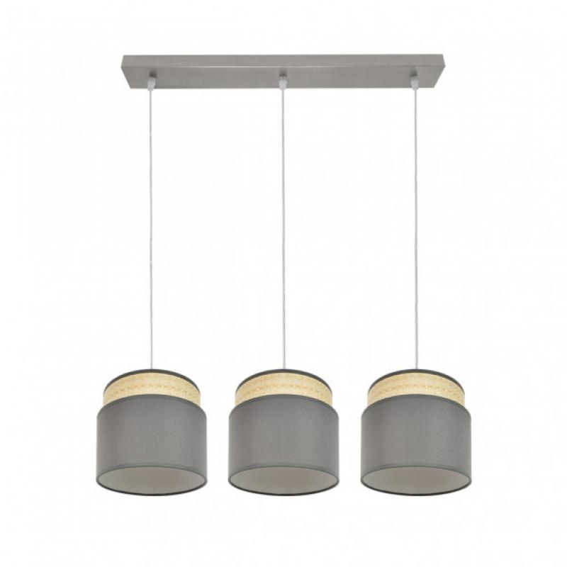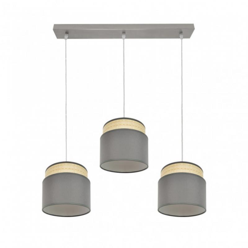 Regleta de tres colgantes de la serie KANDY de color NATURAL/GRIS. Posee tres portalámparas E27. Bombillas no incluidas. Pantallas formadas por dos cuerpos en textil y armazón metálico. De estilo moderno y diseño elegante, ideal para decorar e iluminar en dormitorios, salones y recibidores, aportando calidez a la estancia que ilumina. Sus dimensiones, regulables en altura, son de 46<,106x68x19 centímetros. En esta serie podemos encontrar los colgantes de 60, 50,40 y 30 centímetros de diámetros, dos tamaños diferentes de sobremesas, los apliques, la regleta de tres colgantes y el plafón de tres colgantes, todos combinando arpillera natural con textil en color blanco, negro, gris o marrón.