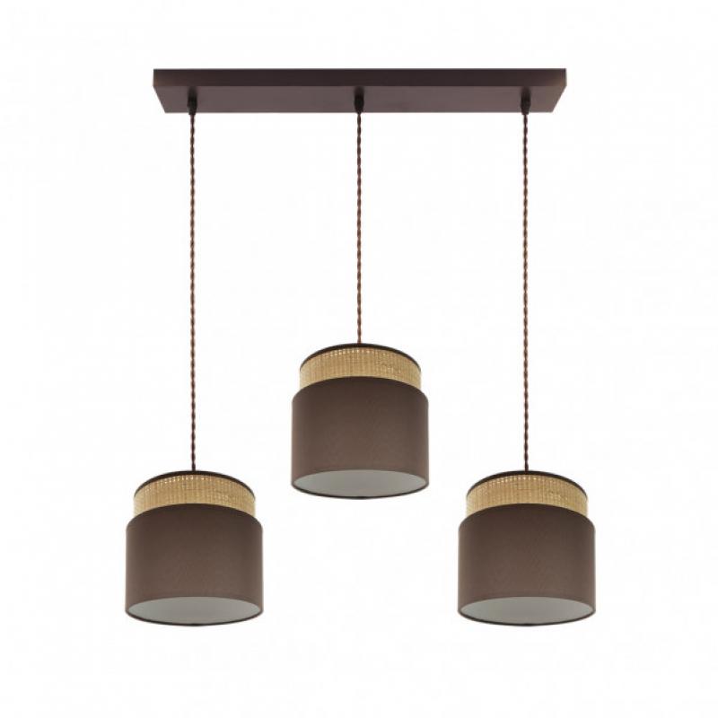 Regleta de tres colgantes de la serie KANDY de color NATURAL/MARRON. Posee tres portalámparas E27. Bombillas no incluidas. Pantallas formadas por dos cuerpos en textil y armazón metálico. De estilo moderno y diseño elegante, ideal para decorar e iluminar en dormitorios, salones y recibidores, aportando calidez a la estancia que ilumina. Sus dimensiones, regulables en altura, son de 46<,106x68x19 centímetros. En esta serie podemos encontrar los colgantes de 60, 50,40 y 30 centímetros de diámetros, dos tamaños diferentes de sobremesas, los apliques, la regleta de tres colgantes y el plafón de tres colgantes, todos combinando arpillera natural con textil en color blanco, negro, gris o marrón.