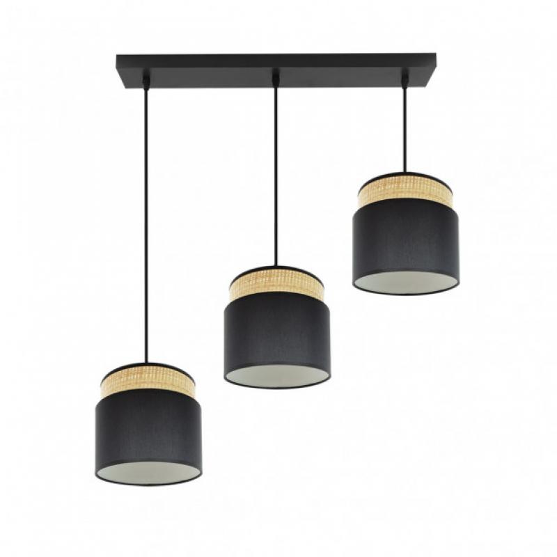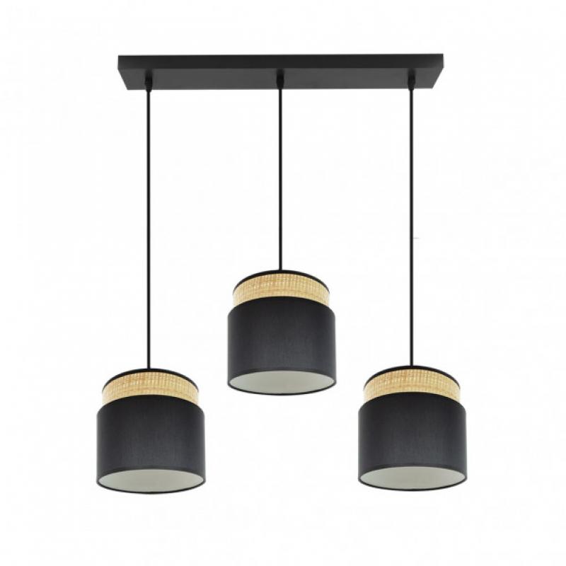 Regleta de tres colgantes de la serie KANDY de color NATURAL/NEGRO. Posee tres portalámparas E27. Bombillas no incluidas. Pantallas formadas por dos cuerpos en textil y armazón metálico. De estilo moderno y diseño elegante, ideal para decorar e iluminar en dormitorios, salones y recibidores, aportando calidez a la estancia que ilumina. Sus dimensiones, regulables en altura, son de 46<,106x68x19 centímetros. En esta serie podemos encontrar los colgantes de 60, 50,40 y 30 centímetros de diámetros, dos tamaños diferentes de sobremesas, los apliques, la regleta de tres colgantes y el plafón de tres colgantes, todos combinando arpillera natural con textil en color blanco, negro, gris o marrón.