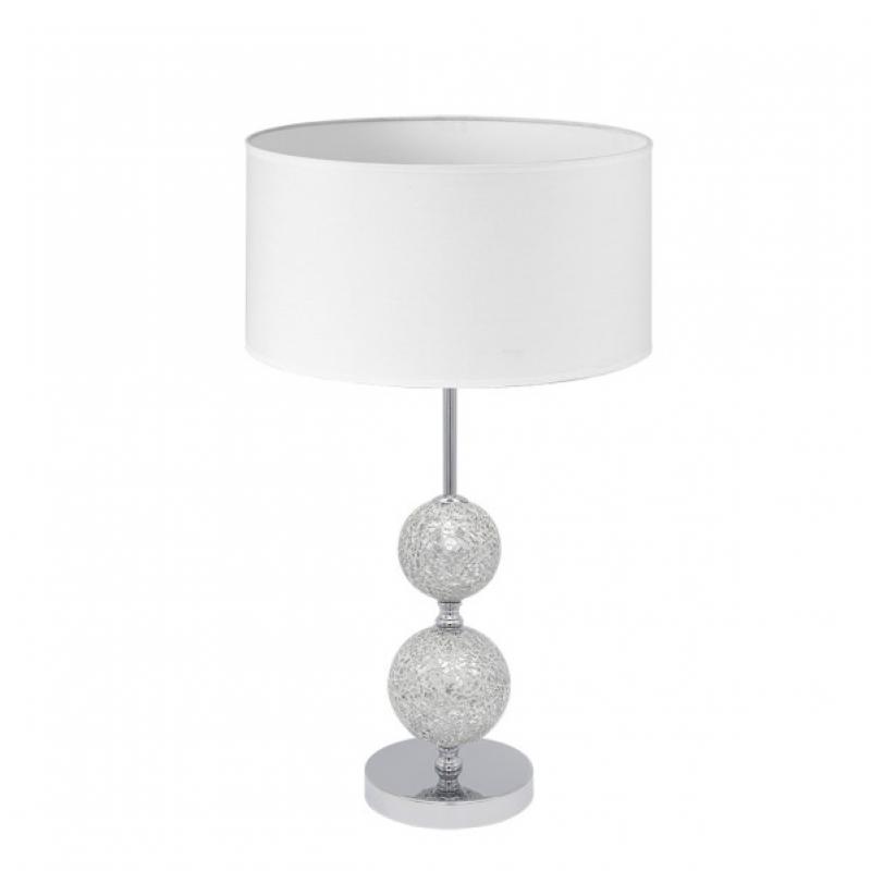 Sobremesa de color CROMO con pantalla de color BLANCO. Realizado en metal, cristal y textil. Este sobremesa se caracteriza por el original diseño que aportan las bolas de pequeños cristales del armazón acompañado de una pantalla cilíndrica, resultando una composición muy decorativa. Tiene unas dimensiones de 50x35x35 centímetros. El portalámparas es E27. Bombilla no incluida.